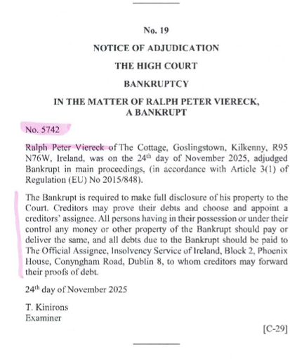 Nunmehr teilte der Prozessbevollmächtigte des Herrn Viereck in einem Verfahren vor dem BGH mit, dass der irische High Court am 24.11.2025 das Insolvenzverfahren über das Vermögen des Herrn Viereck eröffnet habe. Die Veröffentlichung erfolgte am 05.12.2025 im „Iris Oifigiuil“, dem irischen Gesetzblatt: